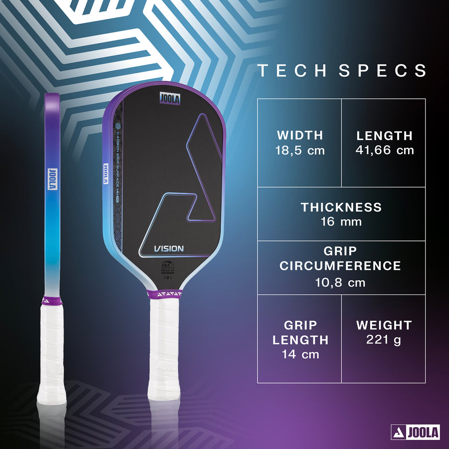 The Hyperion Vision 16mm combines high-quality materials with innovative technology for a top-level playing experience. If you value spin, control, and a unique look, this paddle is the perfect choice for your next match.