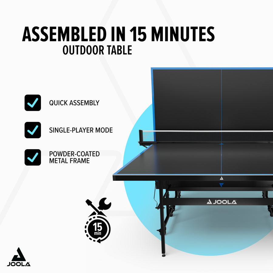 With the JOOLA Outdoor J100A, you bring weatherproof table tennis fun straight to your home – whether on the terrace, in the garden, or the driveway. Thanks to well-thought-out features and robust design, the next rally is always ready, no matter the weather.
