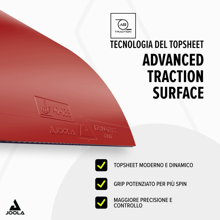 DYNARYZ CMD features a 43° soft sponge, delivering a pleasant touch and impressive sound. Increased control usually comes at the expense of speed and spin with soft rubbers. However, the exceptional quality of the ADVANCED TRACTION topsheet and the HYPER BOUNCE sponge breaks this rule. This makes DYNARYZ CMD appealing to attacking players of all skill levels.