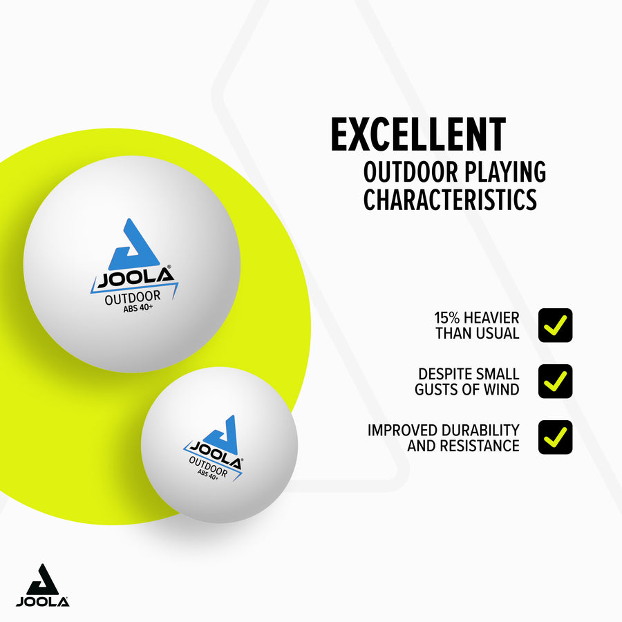 The JOOLA OUTDOOR table tennis ball is perfect for exciting matches outdoors. Thanks to the optimized playing characteristics for outdoor use, with a 15% higher overall weight, it enables great rallies even in light wind conditions.