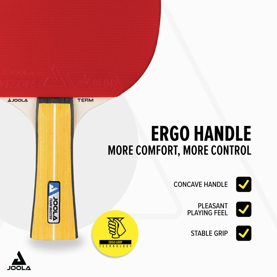 The JOOLA Team Master table tennis racket is the ideal allround racket for advanced players and recreational athletes, as well as for use in school physical education. Thanks to its high-quality materials and innovative rubbers, it offers outstanding playing characteristics for versatile game strategies.