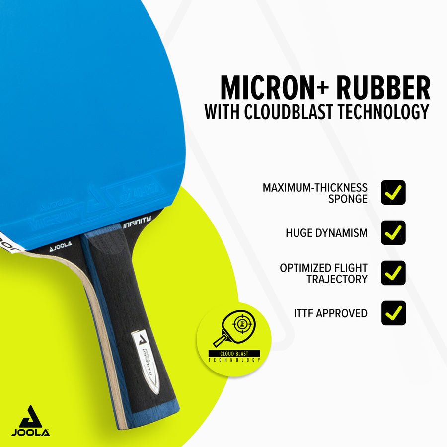 ITTF-approved MICRON+ Rubbers – combined with CLOUDBLAST Power sponge for top spin strength and explosiveness.