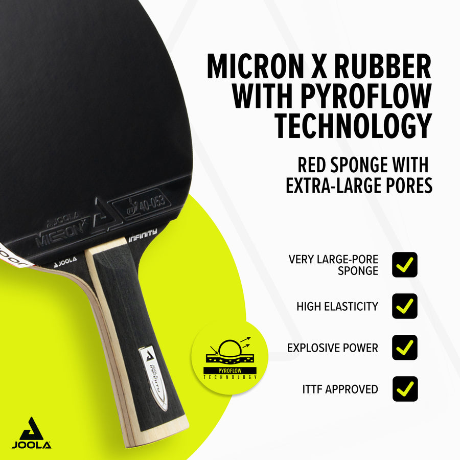 MICRON X Rubbers with PYROFLOW Sponge – highly elastic and porous for maximum catapult effect and dynamic spins.