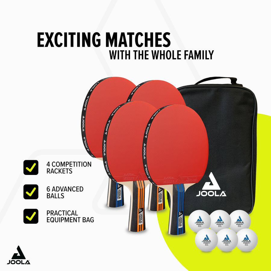 - Complete set: The FAMILY Advanced table tennis set consists of 4 high-quality JOOLA paddles and 6 white table tennis balls, so you can start playing right away.