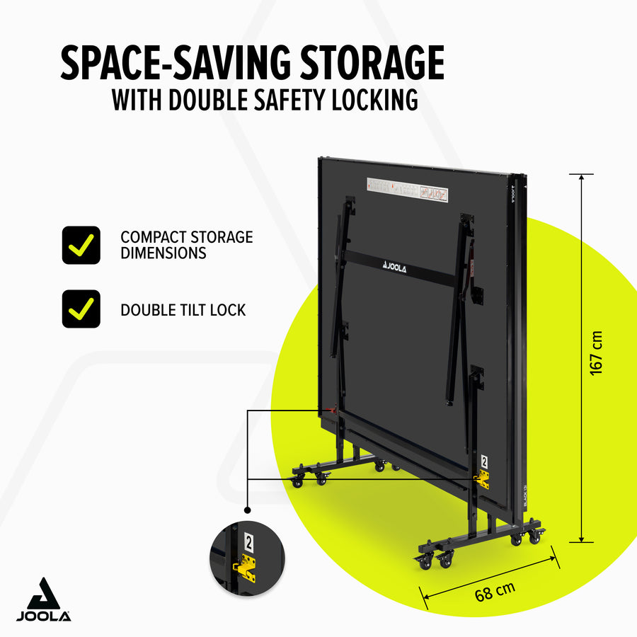 With the JOOLA BLACK 13i table tennis table, you get a high-quality, elegantly designed table that offers excellent playing characteristics and maximum stability. Thanks to the easy-to-use features and quick assembly, you can start your first match immediately and enjoy full playing fun.