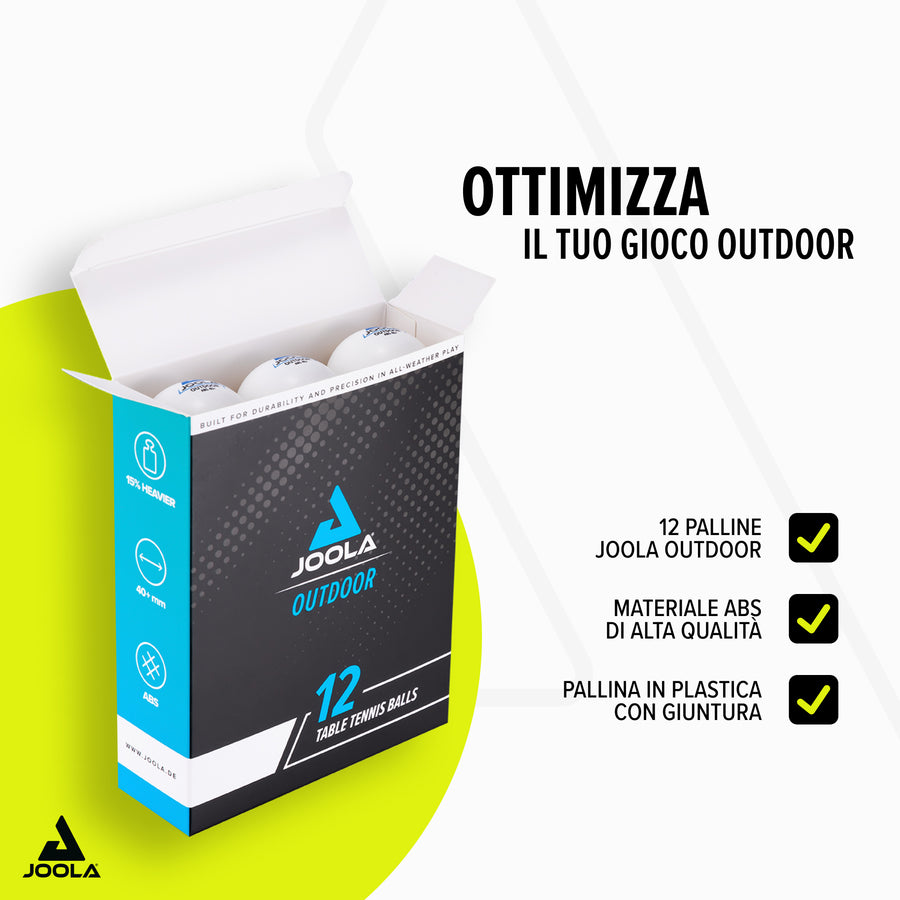 La pallina da tennis da tavolo JOOLA OUTDOOR è la scelta perfetta per chi non vuole rinunciare a eccellenti caratteristiche di gioco anche all'aperto. Con il suo peso aumentato garantisce scambi entusiasmanti e massimo divertimento, anche con vento.