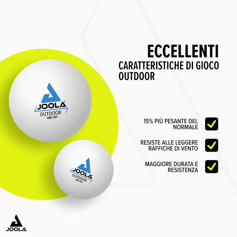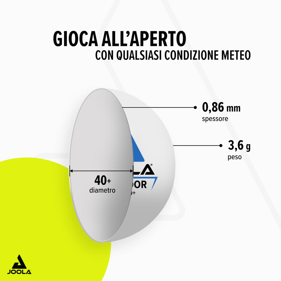 La pallina da tennis da tavolo JOOLA OUTDOOR è perfetta per avvincenti partite all'aperto. Grazie alle caratteristiche di gioco ottimizzate per l'uso outdoor, con un peso totale aumentato del 15%, è possibile ottenere scambi eccellenti anche con un leggero vento.