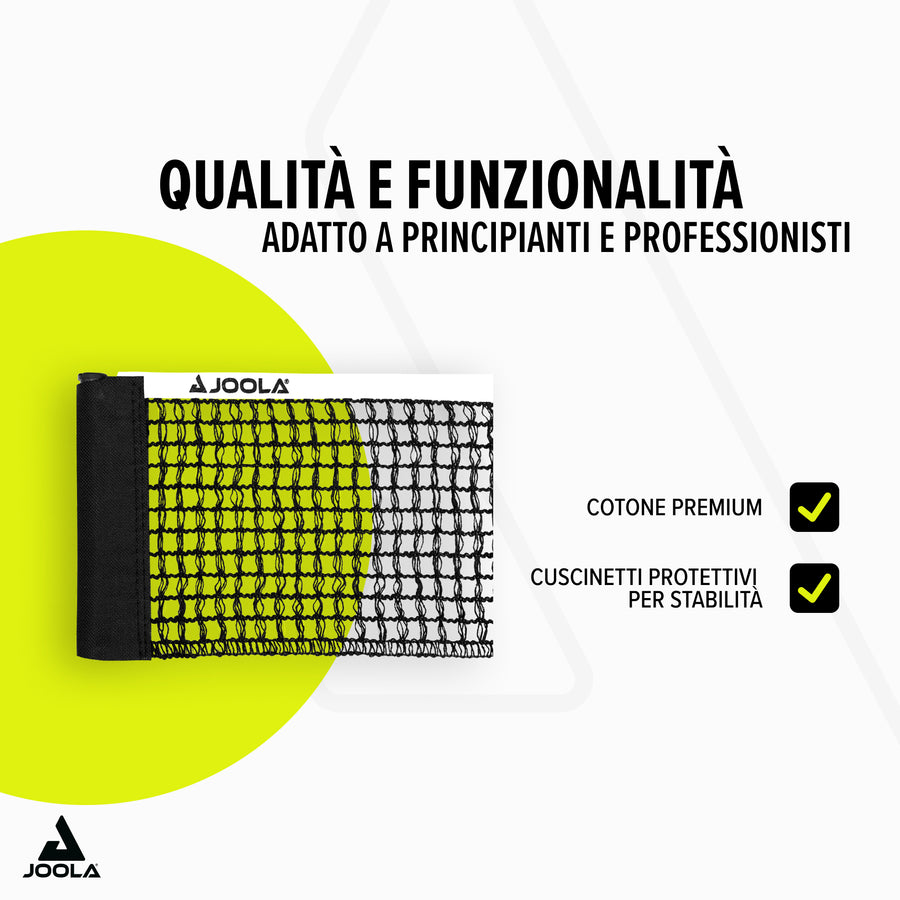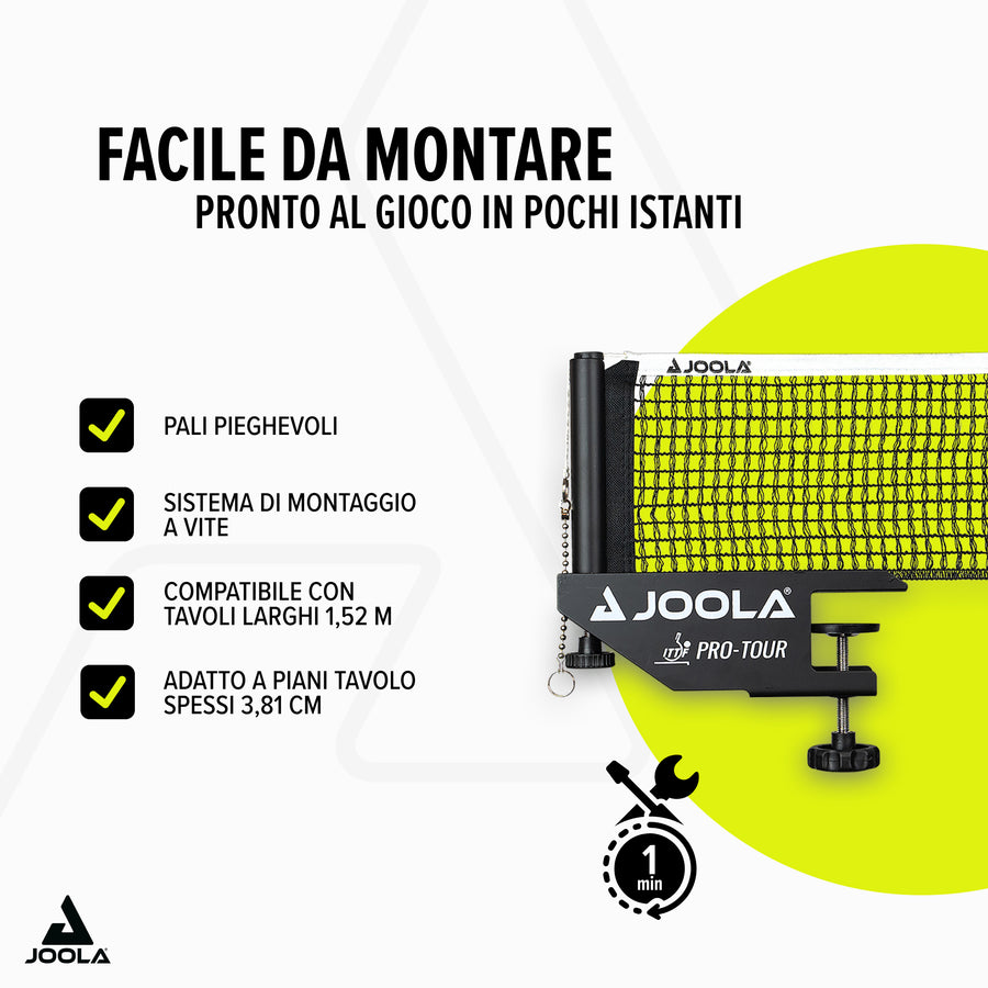 La rete JOOLA PRO TOUR è un set da competizione di alta qualità, approvato dalla ITTF, che si distingue per l'eccellente qualità e un ottimo rapporto qualità-prezzo. Con una micro vite per la regolazione dell'altezza e la robusta rete in cotone e filo di ferro, offre tutto ciò di cui hai bisogno per partite professionali di tennistavolo.