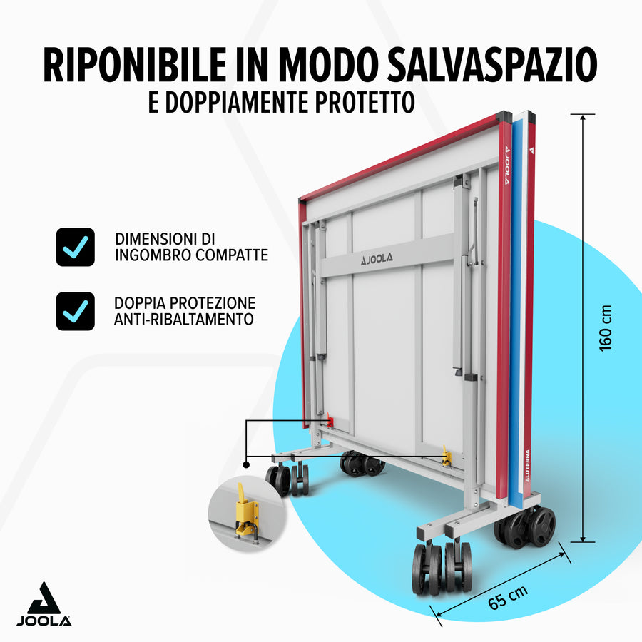 Il JOOLA Aluterna non offre solo una superficie di gioco resistente alle intemperie e un design attraente, ma anche una costruzione ben studiata che unisce stabilità, mobilità e flessibilità. Che si tratti di partite emozionanti con gli amici o di allenamenti in solitaria, questo tavolo ti offre tutto ciò di cui hai bisogno per goderti il tennistavolo all'aperto.