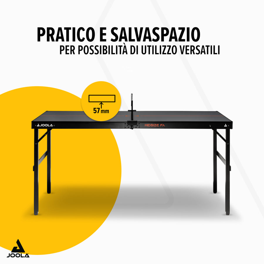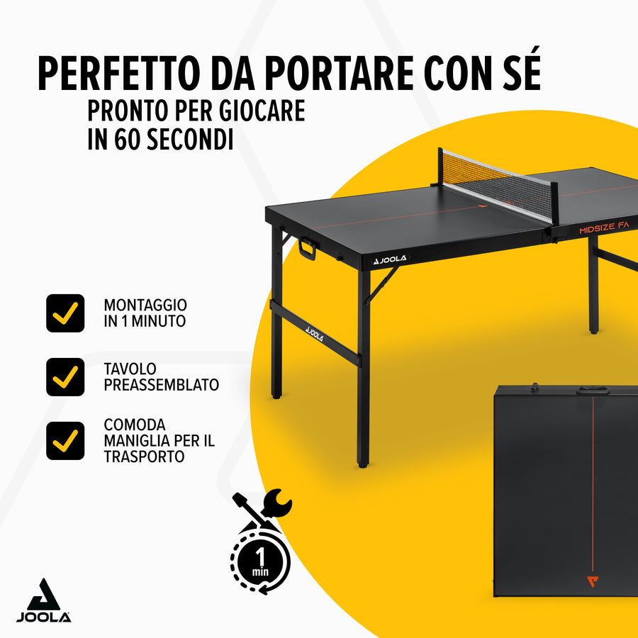 Il JOOLA Midsize FA offre una combinazione ideale di funzionalità, design e divertimento di gioco. Con il suo design compatto a valigia, la facilità d'uso e le eccellenti caratteristiche di gioco, è perfetto per chi desidera integrare il tennistavolo nella propria quotidianità.